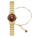 Deze exclusieve editie betovert met een diepe Bordeauxrode wijzerplaat, vol warmte en rijkdom. De kenmerkende ovale kast, gecombineerd met een zacht afgeronde bezel, roept de charme op van antieke gouden fotolijsten en koninklijke spiegels. Het horloge wordt gepaard met een goudkleurige armband, verfijnd met delicate ovale kraaldetails die de contouren van het horloge weerspiegelen. een subtiele ode aan tijdloos vakmanschap.